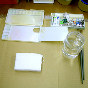粘土に色をつけるため、絵の具、水、パレットなども適宜、用意します。
