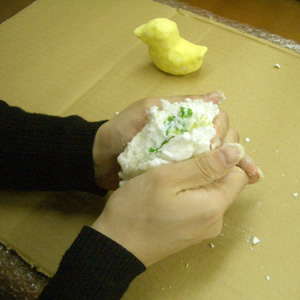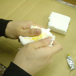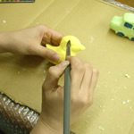 ひよこせっけんの制作所要時間は、モロモロ込みで、約15分。色を混ぜ込まなければ、さらに時間は短縮されますが、あまり面白みがなくなってしまうので、ぜひ色はつけてください。はじめの練り状態のときに、かなり手にべたべたと粘土がひっつきます。お風呂場でやわらかくなったせっけんを想像していただければ、ちょうどそのような感じかと思います。せっけんですので、洗っていただければ落とせます。