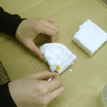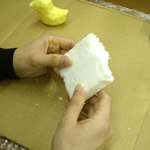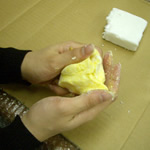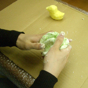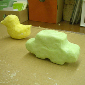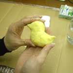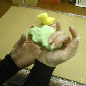 せっけんねんど1個は200gですが、一般的なK王さんの手洗い用石鹸で、90g。ちょうどひよこ位の重さです。やはり100g前後で1つ作るのが、作りやすさ、実用性共に、妥当なところだと思います。イベントだと、二人で1つ、もしくは、一人で二つ作るような進め方が良いと思います。