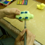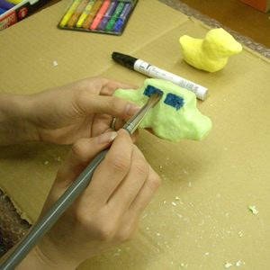 最後に、絵の具で目をかきます。作り終わった状態で、ある程度しっかりしているので、持ち上げてしまっても崩れたりはしません。作ってすぐに色づけしても大丈夫です。