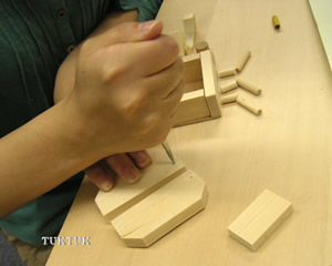数十分のイベントで手軽に行うにはかなり無理がある商品です。工作教室として、きちんと講師がついて一日がかりで行うくらいの規模でないとお使いいただくのは難しいでしょう。釘などは使いませんが、キリを使う必要があるので、あまり危ないことをさせたくない場合は、事前にスタッフが穴を開けておくなどの配慮が必要です。
