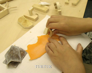 丸みを出したい部分に、ヤスリをかけます。濡らした新聞紙を敷いておくと、粉が飛ばなくていいですよ。