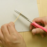 パーツが貼れたら、ちょうど真ん中のところに目打ち、キリなどで穴をあけます。竹串の先が通せるくらいの大きさです。大きすぎると竹串がゆるくなり固定できなくなるので、少し小さめに穴をあけてくださいね。