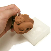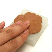 もくねんさんを少しだけ(直径1.5cmの球になるくらい)ちぎり、型からはみでないように、軽くつめます。
