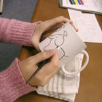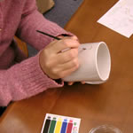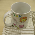 白い陶器のマグカップに、特殊絵の具で色をつける工作です。